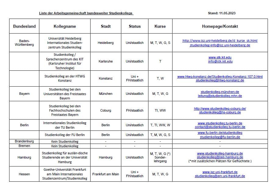 کالج در آلمان به عنوان پلی بین تحصیلات متوسطه در کشورهای خارجی و تحصیلات عالی در دانشگاههای آلمان شناخته میشود. برای مطابقت تحصیلی کشورهای مختلف با سیستم تحصیلی در کشور آلمان و آماده کردن داوطلبان خارجی برای تحصیل در دانشگاههای آلمان، کالجها در آلمان دورهٔ یک سالهای را ارائه میدهند که در طی آن دانشجو با مفاد درسی مورد نیاز برای تحصیل در رشتهٔ مورد نظر خود در دانشگاه و همین طور با زبان آلمانی تخصصی برای تحصیل در آن رشته آشنا میشود. ازجمله مزایای این کالجها میتوان به موارد زیر اشاره کرد: